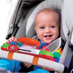 Kręć kierownicą i obserwuj autko jeżdżące na desce rozdzielczej, naciskaj guziczki ze strzałkami, przekręć kluczyk w stacyjce i sprawdź jakie odgłosy wydają zwierzaki. Na środku kierownicy znajduje się klakson, zupełnie jak w prawdziwym samochodzie! Zabawka wyposażona jest w wyłącznik, dzięki czemu bobas może z niej korzystać w każdym miejscu. Panel sterowania posiada z tyłu praktyczne taśmy, więc bez trudu przymocujesz go do dziecięcego wózka.