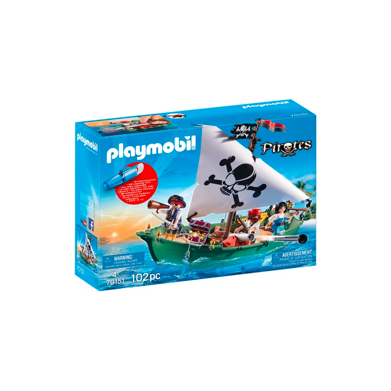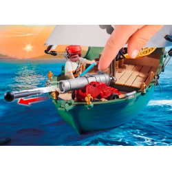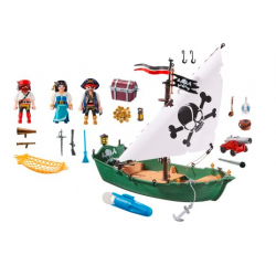 Statek piracki od Playmobil to doskonała propozycja dla każdego małego pirata. Statek wyposażony w liczne elementy oraz silnik podwodny, który sprawia, że łódź unosi się na wodzie. Cztery punkty zacisków w różnych miejscach pokładu sprawiają, że łódź jest stabilna i nie straszne jej są nawet największe fale. Działo dołączone do zestawu strzela i może być zamontowane z boku w dwóch punktach na pokładzie lub z przodu dziobu. Niesamowity efekt sprawia także flaga piracka, która może zostać podniesiona podczas ataku. Zawartość pudełka: