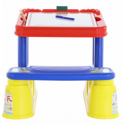 ZESTAW PRZEDSZKOLAKA od firmy Polesie. Jest to biurko połączone z wygodną ławeczką. Tablica umieszczona na blacie jest dwustronna (na kredę oraz mazak suchościeralny).