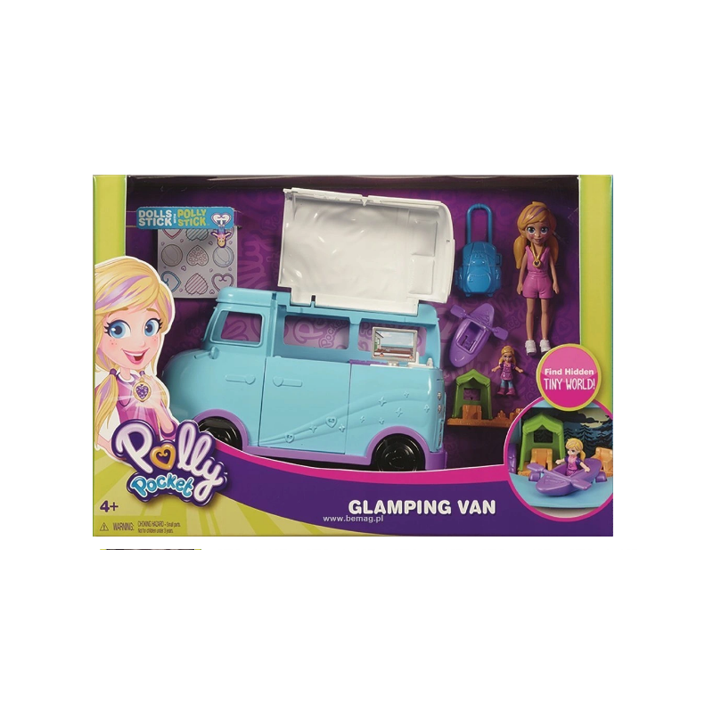 Zestaw do zabawy z kamperem obejmuje: lalkę Polly o wysokości 7,5 cm z akcesorium, miniaturową laleczkę Polly oraz miniaturowy kemping z namiotem, „ogniskiem” i minikajakiem.