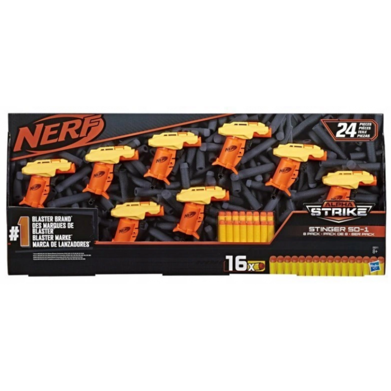Miotacz strzela jedną strzałką na raz. Są to niezwykle proste w użyciu wyrzutnie, które nie wymagają baterii. Zestaw Alpha Strike jest 24-częściowy: zawiera 8 miotaczy Stinger SD-1 i 16 oficjalnych rzutek Nerf. Wyrzutnie z serii Alpha Strike to doskonały sposób na wejście do pełnego adrenaliny świata Nerf.