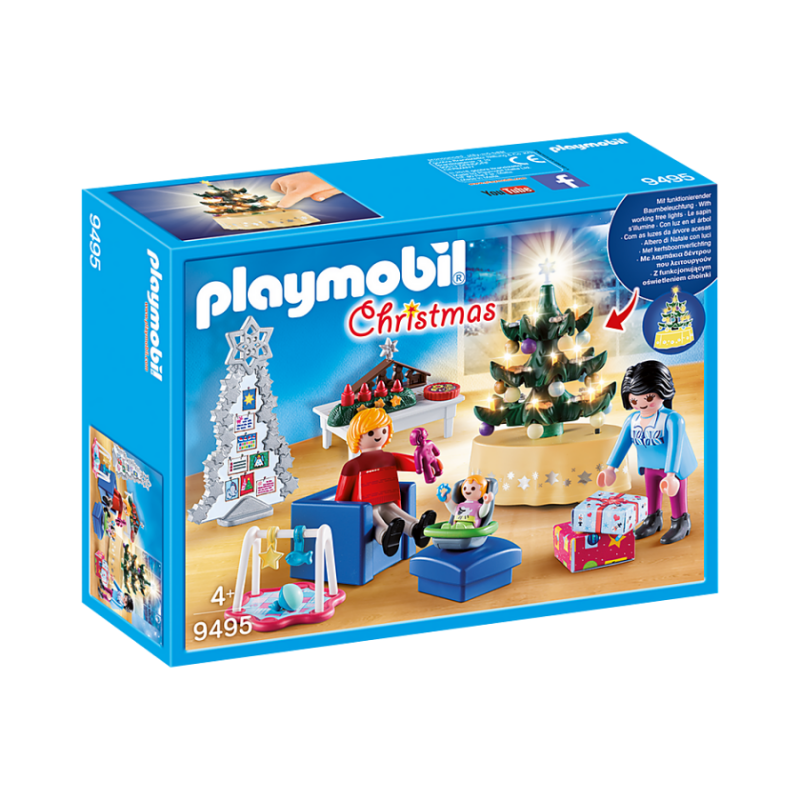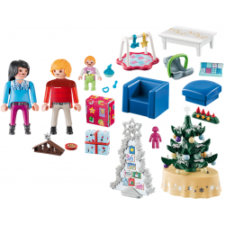 Salon w świątecznym wystroju 9495 to wspaniały komplet uzupełniający do wyposażenia domku Playmobil. Wszystko jest odświętnie przystrojone z okazji zbliżających się świąt Bożego Narodzenia. Na stole jest stroik adwentowy, bombki zawisły na choince, a tablica świąteczna jest wyposażona w obrazki i listy życzeń. Dziecko radośnie macha grzechotką i bawi się na macie z zabawkami. Mama i tata patrzą radośnie na swoje małe dziecko i czekają na wspólne świętowanie. Zestaw stanowi wspaniałe uzupełnienie serii, ale świetnie nadaje się również do zabawy z pominięciem innych zestawów. Zawartość i cechy zestawu: