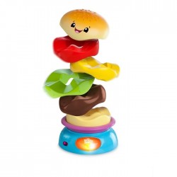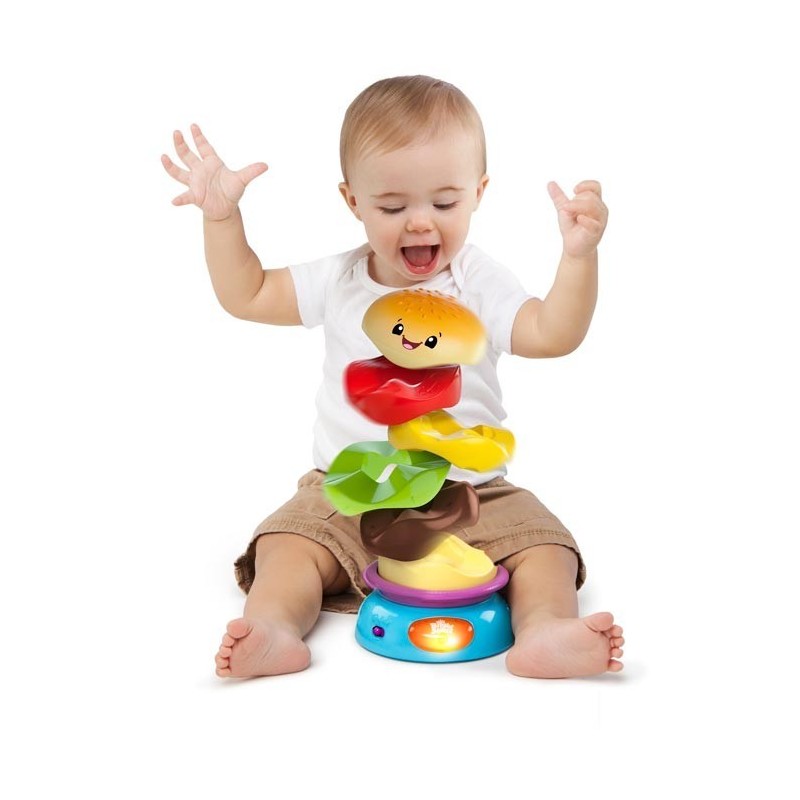 Kiedy dziecko ułoży piramidkę i naciśnie przycisk znajdujący się na podstawie zabawki, zobaczy jak kanapka zacznie zabawnie wirować, rozpadając się na poszczególne elementy, co z pewnością wywoła u niego salwę śmiechu.
