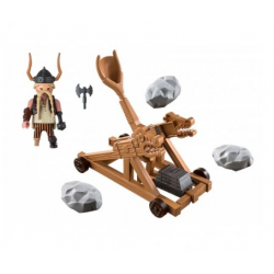 PLAYMOBIL 9245 Pyskacz Gbur i katapulta - Żaden wiking nie jest tak wojowniczy jak Pyskacz kiedy trzeba bronić Berk, szczególnie gdy można przy tym stać w jednym miejscu. Najlepszy kowal na wyspie atakuje wypuszczając kamienie z katapulty, która zatopiła nie jedną łódź najeźdźcy. Na miejscu protezy dłoni nosi topór dwustronny lub maczugę nabitą ćwiekami.