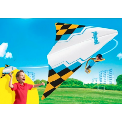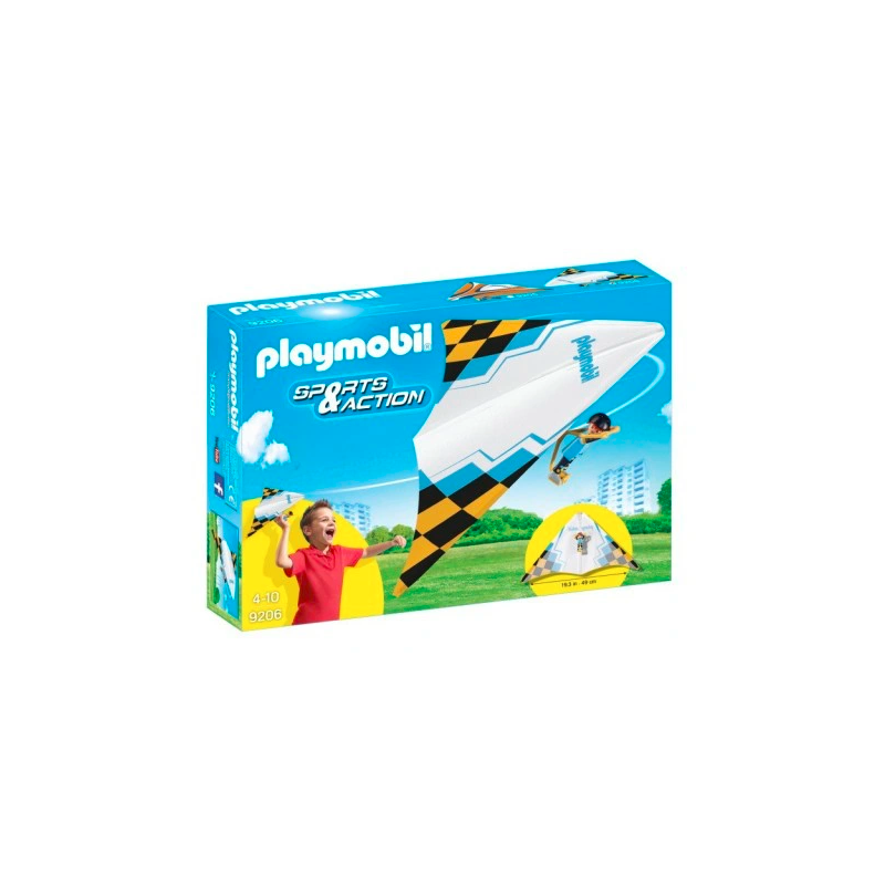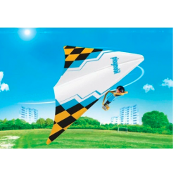 Sporty ekstremalne gwarantują olbrzymi zastrzyk adrenaliny! Poznajlotniarza Jacka, który szybuje wysoko w powietrzu ponad dachami budynków! Figurkę zakładamy na specjalny stelaż, w który wyposażony jest biały latawiec z żółto-czarną kratą z logo Playmobil. Latawiec z figurką to zabawka, która świetnie sprawdzi się również na zewnątrz. Jego rozpiętość to 49 cm.