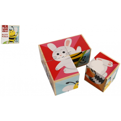 Klocki drewniane o wymiarach jednego 5x5x5cm , z których można ułożyć sześć obrazków - zwierzątek o wymiarach 10x10cm