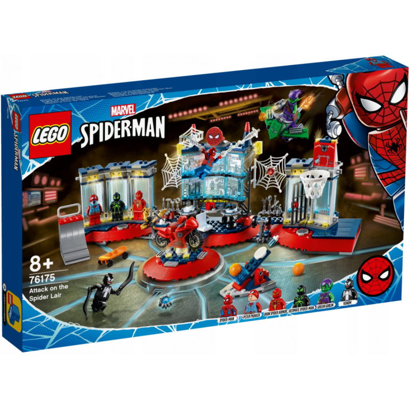 • Zestaw LEGO® Marvel Spider-Man Atak na kryjówkę Spider-Mana (76175) zawiera wszystko, czego potrzebuje nastoletni superbohater. To pierwsza wersja zaawansowanej technologicznie siedziby Spider-Mana zrobiona z klocków LEGO.