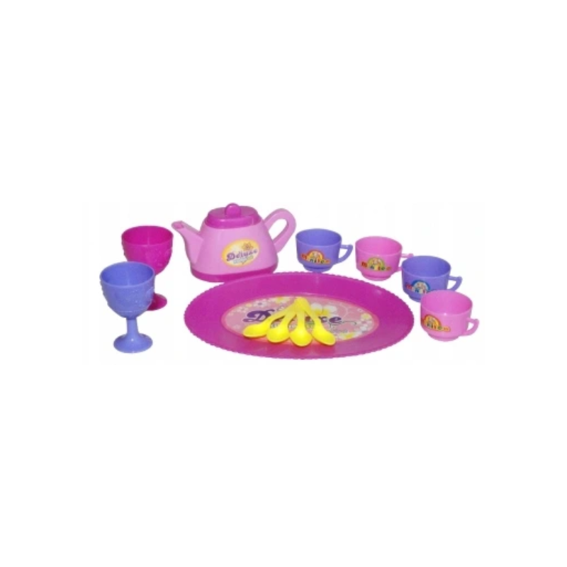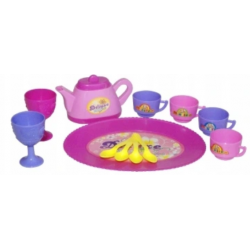 Zestaw plastikowych naczyń z tacką. Produkt składa się z: czajnika, 2 kieliszków, 4 filiżanek, 4 łyżeczek i tacki.