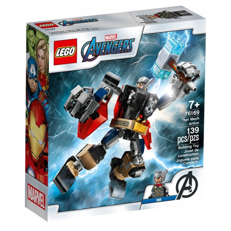 Opancerzony mech Thora . Sięgnij po zestaw LEGO® Marvel Avengers Classic Opancerzony mech Thora (76169), aby Twój superbohater stał się jeszcze potężniejszy! W tej zabawce akcji do zbudowania znajdziesz mecha Thora, który ma ruchome kończyny i wielki odłączany młot.