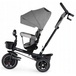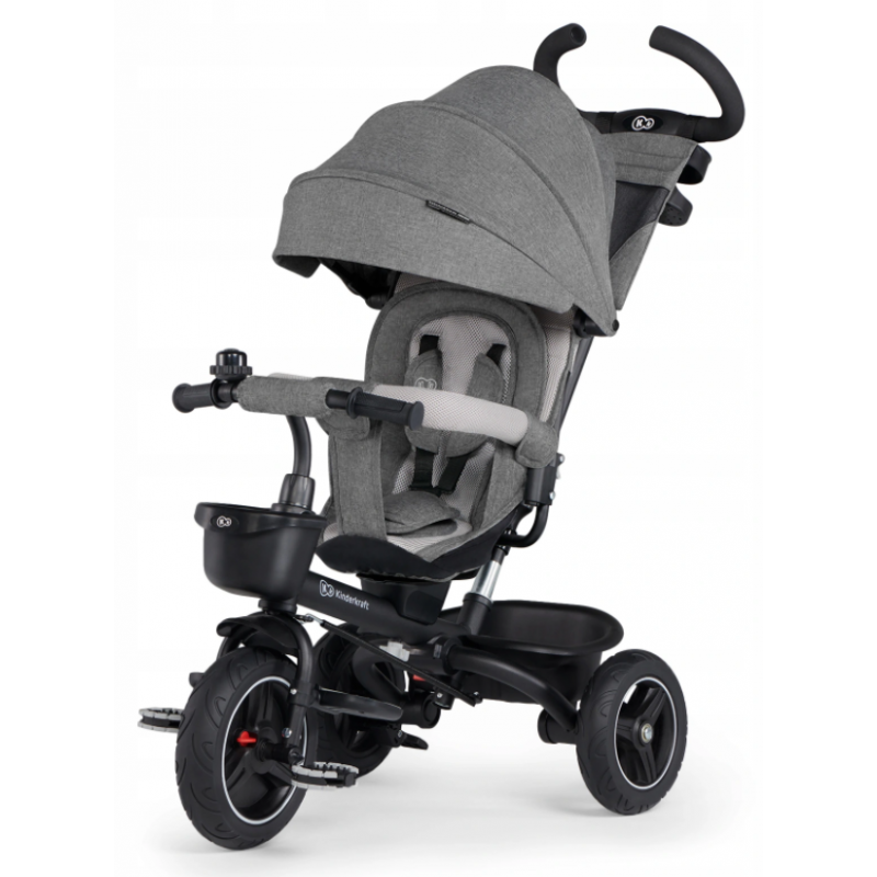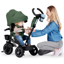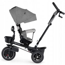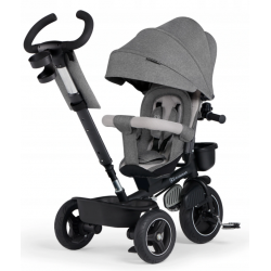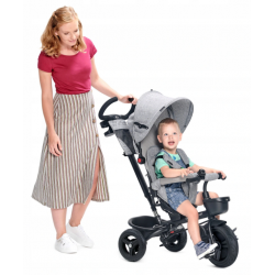 Posiada uchwyt do pchania i skręcania dla rodzica z regulacją wysokości. Wkładka dla najmniejszych dzieci, pasy bezpieczeństwa, oraz pałąk zabezpieczający zapewniają bezpieczną jazdę najmłodszym, a regulowany daszek ochroni przed słońcem.