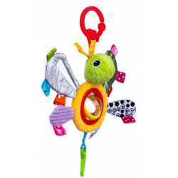Lulu to idealny towarzysz zabaw! Posiada kolorowe skrzydełka ozdobione metkami o zróżnicowanej fakturze. Dodatkowo, każde ze skrzydełek wykonane jest z innego materiału i różni się kolorem, aby jeszcze bardziej stymulować zmysł wzorku i dotyku maluszka. W brzuszku Lulu kryje się obrotowa kulka wypełniona grzechoczącymi koralikami, które rozweselą bobaska. Doczepiony do zawieszki gryzaczek przyniesie ulgę obolałym dziąsełkom ząbkującego malucha. Praktyczna klamra pozwoli przyczepić zabawkę w dowolnym miejscu.