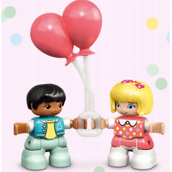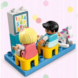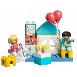 Zestaw LEGO® DUPLO® Pokój zabaw wypełniony jest możliwościami pomysłowej zabawy w odgrywanie ról. Bawić się można nawet pudełkiem, ponieważ ma kształt domku. Nowoczesne kolory, ciekawe funkcje i szczegółowe figurki zapewnią maluszkom długie godziny naprawdę wciągającej zabawy. Rozwijająca zabawka dla małych dzieci Odgrywanie pomysłowych historii z chłopcem i dziewczynką w pokoju zabaw pomoże dzieciom rozwijać koordynację wzrokowo-ruchową. Kącik do nauki zachęci je do zabawy w szkołę i powtarzania przedszkolnej wiedzy. Maluchy mogą nawet urządzić przyjęcie urodzinowe z zabawkami, lodami, prezentem i balonami. Do tego rodzice i opiekunowie mogą uczestniczyć w rozwoju swoich małych konstruktorów, wspólnie z nimi budując i bawiąc się. Prezent do zabawy w udawanie dla dzieci Pomysłowe zestawy LEGO DUPLO zapewniają młodym konstruktorom narzędzia do swobodnej zabawy, wyrażania siebie i nauki. Te edukacyjne zabawki dla maluchów i przedszkolaków zachęcają do nauki poprzez zabawę w udawanie znajomych postaci oraz kreatywne budowanie.