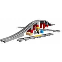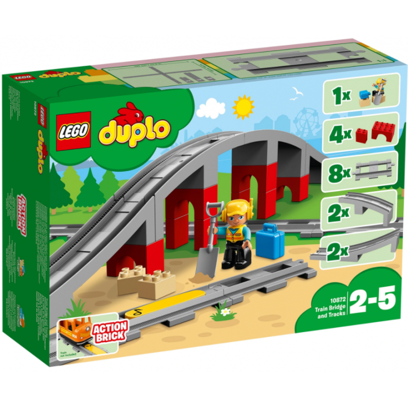Dodaj zestaw LEGO® DUPLO® 10872 Tory kolejowe i wiadukt do dowolnego z nowych lub istniejących zestawów kolejowych DUPLO, by wspomóc rozwój pierwszych umiejętności konstrukcyjnych swojego dziecka. Maluszek może budować wysoki wiadukt i układać tory na różne sposoby. Pomóż mu także ustawić żółty klocek funkcyjny na torach, a przejeżdżające nad nim zgodne pociągi DUPLO odegrają sygnał dźwiękowy. W zestawie znajdziesz figurkę pracownika budowy LEGO DUPLO, dwa klocki luzem, łopatę i walizkę, które ułatwią zabawę i opowiadanie historyjek.