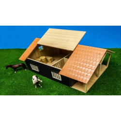 Duża drewniana stajnia wykonana została całkowicie z drewna i materiałów drewnopodobnych w skali 1:24. We wnętrzu posiada 2 boksy dla koni oraz pomieszczenie gospodarcze.