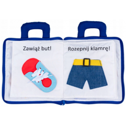 Materiałowa książeczka, która wprowadzi najmłodszych w świat praktycznych umiejętności, takich jak sznurowanie buta, zapinanie guzików, wiązanie tasiemek czy odczytywanie godziny. Każda ze stron kryje inne zadanie, rozwijające sprawność małych paluszków. Praktyczny zamek błyskawiczny pozwoli zapiąć książeczkę, gdy maluch zakończy zabawę, aby nie zgubić żadnego z elementów.