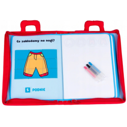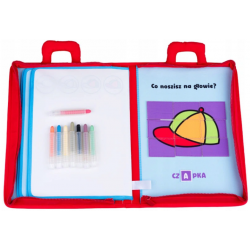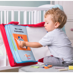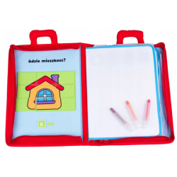 Książeczka zapewni dziecku przestrzeń do malowania, prowadząc je krok po kroku przez proces tworzenia rysunku. Po jednej stronie książeczki znajdują się puzzle na rzep, które tworzą obrazek, po drugiej stronie, pusta przestrzeń do rysowania. Aby ułatwić maluchom zadanie, na górze każdej z pustych stron znajduje się obrazkowa instrukcja tworzenia rysunku widocznego na układance obok. Do książeczki dołączone są specjalne kredki i magiczne gąbeczki, które po zmoczeniu zmażą namalowane wcześniej dzieło, aby zabawa mogła się rozpocząć od początku. Każda z obrazkowych układanek opisana jest nazwą widocznego na niej przedmiotu lub pojazdu. Całość uzupełniają wygodne uchwyty i praktyczny zamek błyskawiczny, który pozwoli zapiąć książeczkę.