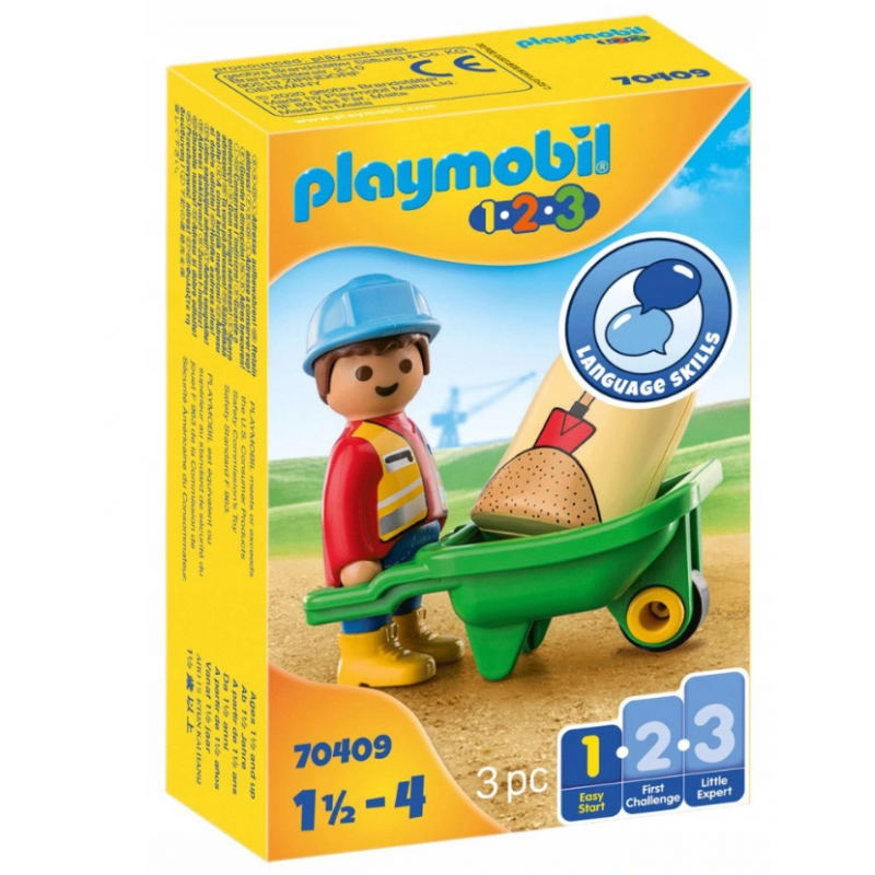 Pracownik budowlany z taczką 70409. Przetransportuj na budowę razem z pracownikiem budowlanym worek piasku. Zestaw stanowi wspaniałe uzupełnienie zestawów tej firmy, a tym samym daje możliwość tworzenia nowych wątków podczas zabawy.