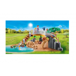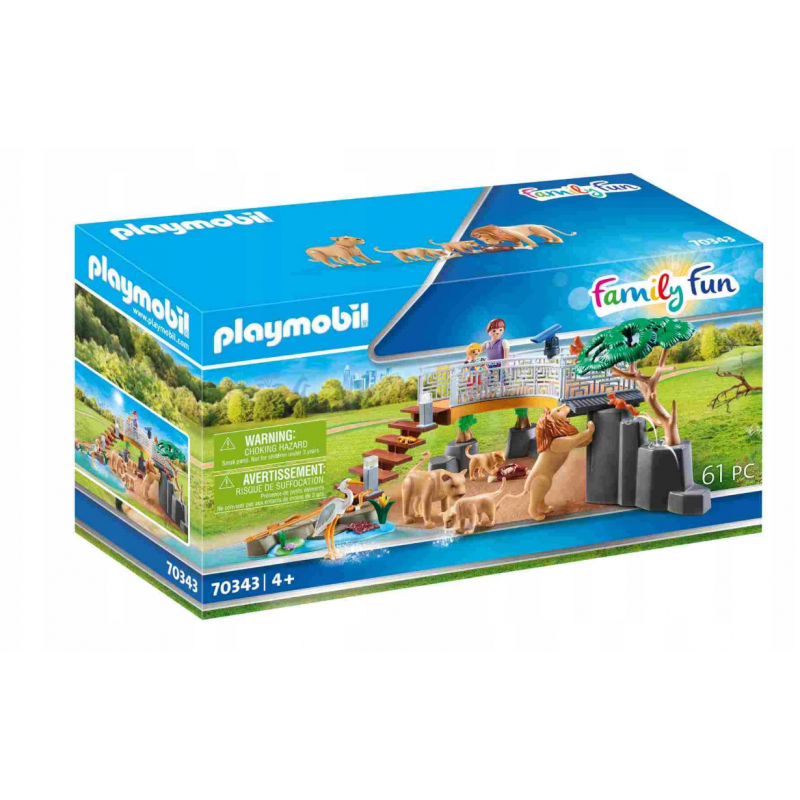PLAYMOBIL® Family Fun 70343 Lwy na wybiegu Z platformy widokowej mama z synkiem obserwują lwy na wolnym wybiegu. Platformę można rozbudować o zestawy: 70341 i 70348. Wymiary: 37 x 27 x 15 cm (DxSxW).