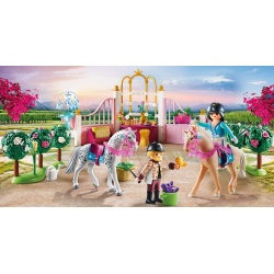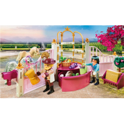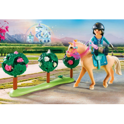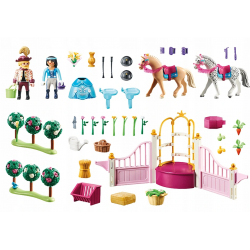 Stajnie i oczywiście konie, to jest świat Piny. Tutaj czuje się najbardziej swobodnie i lubi spędzać cały dzień z ukochanymi końmi. Jako królewska instruktor jazdy uczy księżniczki jazdy, jak jeździć i wszystkiego, co jest ważne dla opieki nad końmi i właściwego obchodzenia się z dumnymi zwierzętami. Prawdziwa księżniczka jeździ oczywiście na siodle kobiety, ale to może być czasem wyzwaniem. Ale nawet trudne przypadki nie są dla Piny problemem i zawsze znajduje rozwiązanie. W skład zestawu wchodzą PLAYMOBIL-figury Pina i króla, dwa konie i ptak, elementy stajni oraz komoda, w której można przechowywać drobne akcesoria. W zestawie znajduje się również rząd kasków i siodło, a także nowe siodło boczne pozwalające spódnicom na jazdę konną.
