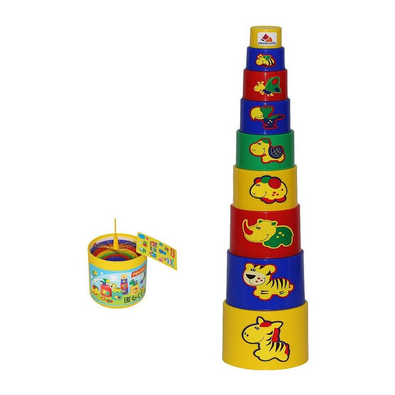 Zabawka składa się z 9 elementów. Jest pomocna przy nauce przez dzieci kolorów, rozróżniać obrazki a także pozwoli na rozwinięcie dziecięcej motoryki rąk. Zadaniem dziecka jest ułożenie piramidki z małych kubeczków w kolejności od największego do najmniejszego. Dzięki temu maluch poznaje kolory, obrazki, a także świetnie się przy tym bawi i ma możliwość nauki liczenia do 9ciu. Kubeczki świetnie się składają jeden w drugi, nie zajmują wiele miejsca.Można je zabrać ze sobą na wakacje na plaże lub po prostu uczyć dziecko w łatwy przyjemny sposób liczenia itp.