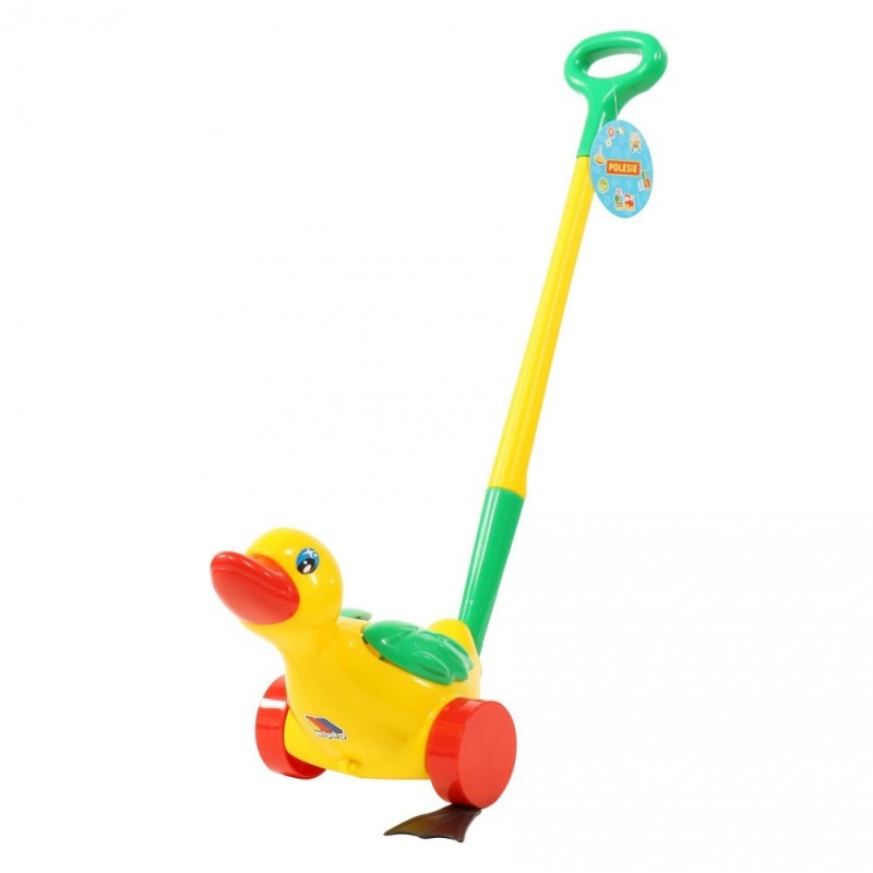 Zabawna kaczuszka, która jest doskonałą zabawką dla maluszka. Pchając za wygodną rączkę, kaczuszce obracają się kółeczka i kłapią gumowe łapki.